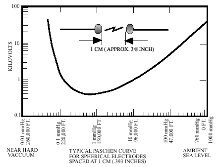 In the 19th century, Paschen, a German scientist, conducted experiments to determine electrical arc char-acteristics when ambient pressure changed. He spaced two spherical electrodes at a constant 3/8 inch (1cm). He then reduced the ambient pressure in increments from sea level (760 mm Hg.) to 260,000 ft. (0.01 mmHg.). At each selected pressure increment he increased the voltage across the electrodes until a low-energy arc occurred.
